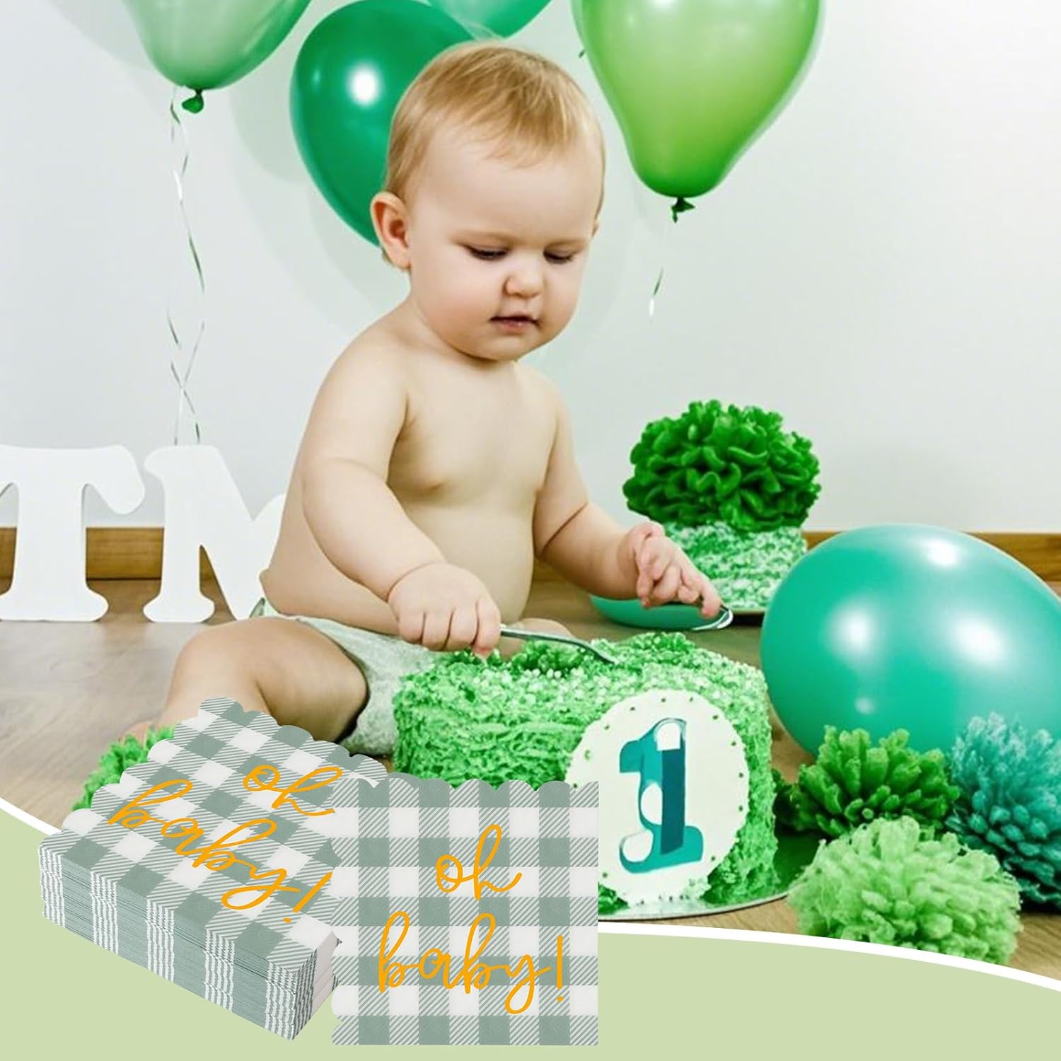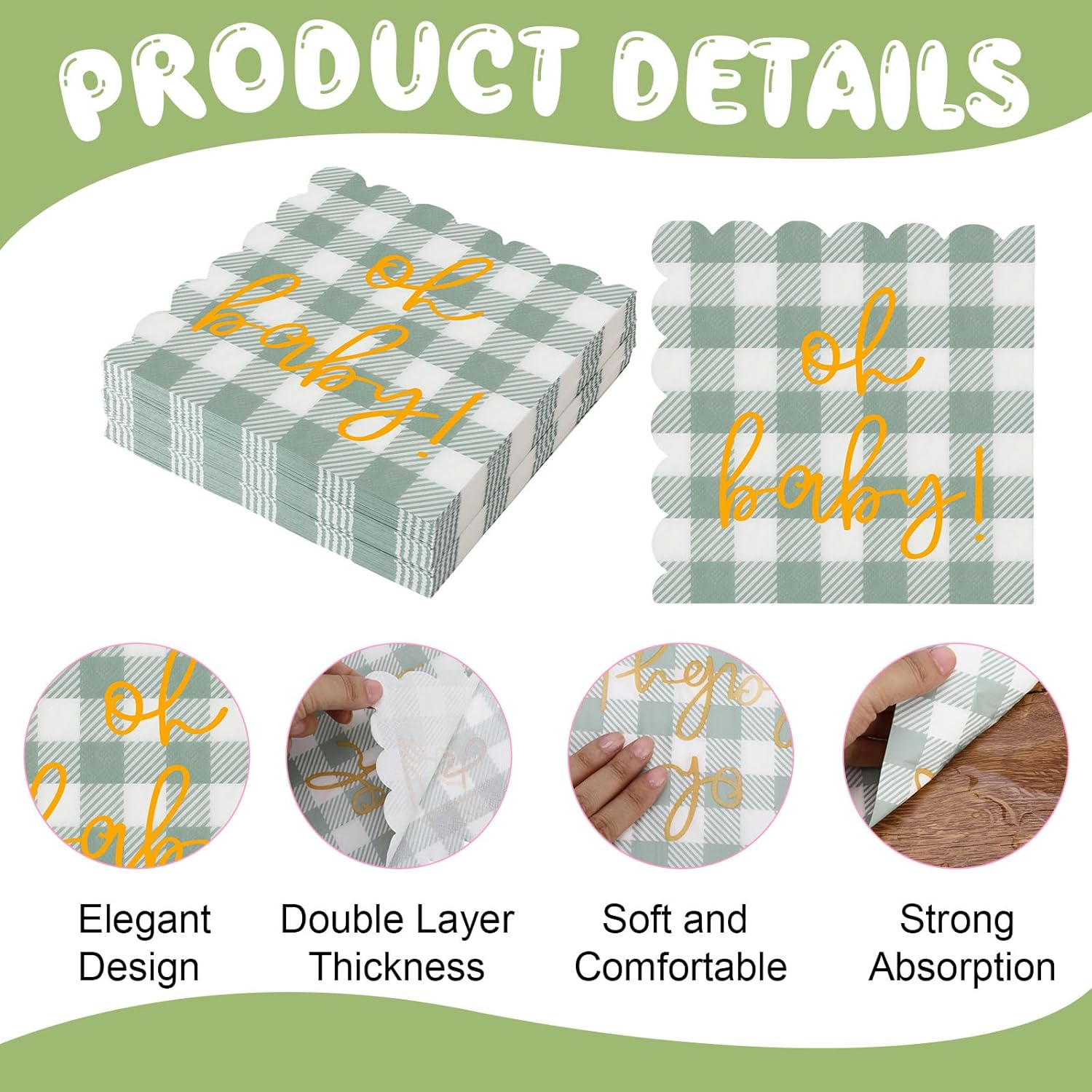 100 Psc Oh Baby Baby Shower Napkins, Gold Oh Baby Napkins in Plaid Sage Green Pattern, Scalloped Edges, 6.5 x 6.5 Inch for baby Welcome Party, Neutral Gender Reveal Decorations