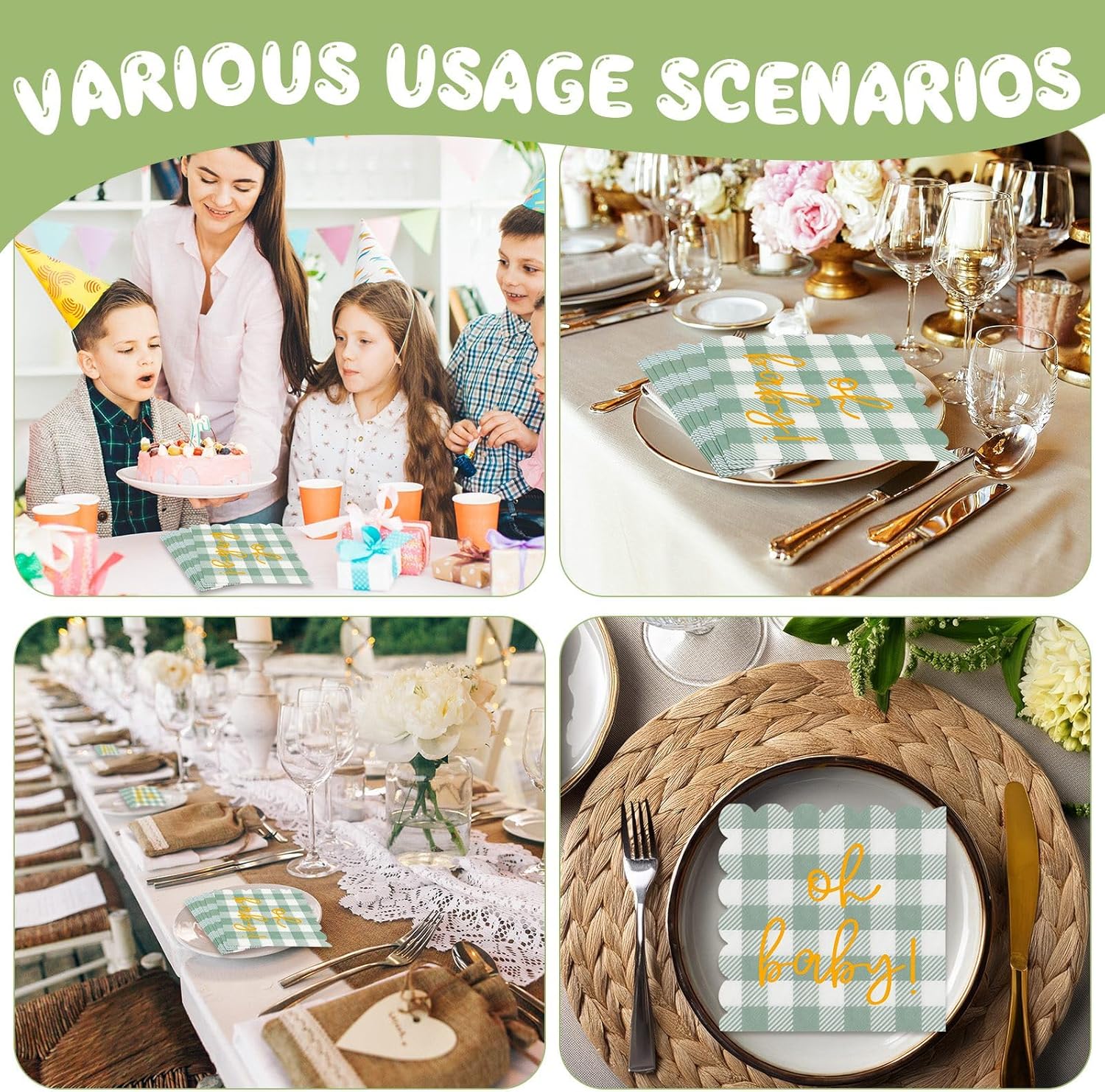 - Package Included: You will receive 50 pcs 6.5 x 6.5” plaid sage green pattern baby shower napkins, just the right amount for a baby shower, add this napkin set to your baby shower party supplies for your upcoming graduation party, kids birthday party, baby shower, anniversary day, festival, wedding, or family gathering