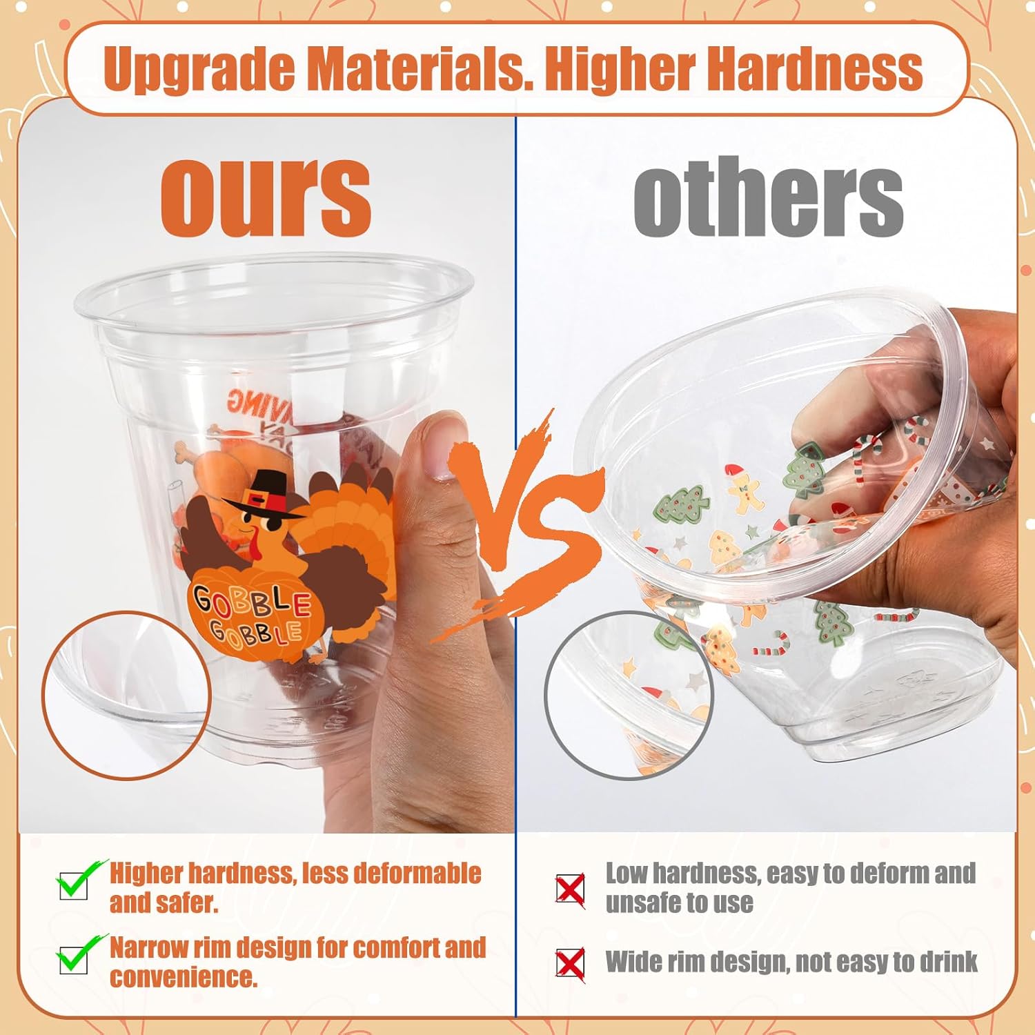 - High Quality Material: Our Thanksgiving disposable plastic cups are made from premium-grade PET material, ensuring durability and reliability. These fall disposable cups are sturdy enough to resist cracks and leaks. This high-quality material also offers a crystal-clear look, adding elegance to your Thanksgiving decorations for party or friendsgiving party decorations
